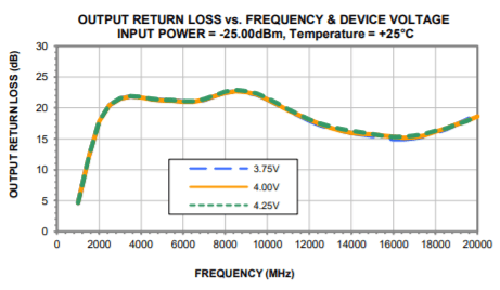 Another of our recent distributed amplifier models is the LTA-2183-D+. This amplifier operates from 2 to 18 GHz with 16 dB gain and ±0.7 dB flatness over its full frequency range. It provides 19.6 dBm typical output power at 1 dB compression, 27.6 dBm OIP3 and 47.4 dB directivity. The amplifier operates on a 4V supply with 210 mA DC current consumption. Performance plots for gain, input and output return loss are shown below in Figure 6.