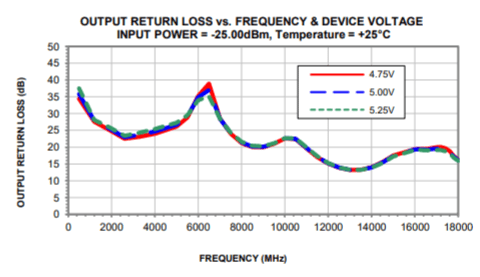 Another example of a Mini-Circuits distributed amplifier is LTA-5R183-D+. This is amplifier covers an even wider frequency range, extending from 500 MHz to 18 GHz. It delivers 18.6 dBm P1dB with a gain of 13 ±1.6 dB, and a noise figure around 3 dB. Figure 7 shows performance plots for the gain, input and output return loss for this amplifier.