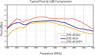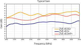 Figure 3: Typical gain and output power performance for Mini-Circuits’ ZVE-453+ series of ultra-wideband amplifiers.