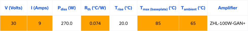 ZHL-100W-GAN+ ➜ Trise (⁰C) = Pdiss (W) x Rth (⁰C/W) = 270W x 0.074 (⁰C/W) = 20⁰C
