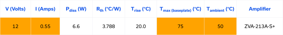 ZVA-213A-S+ ➜ Trise (⁰C) = Tmax(baseplate) (⁰C) – Tambient (⁰C) = 75⁰C – 50⁰C = 25⁰C