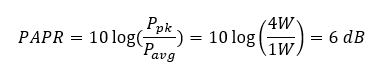 Take for instance the graph of power vs. time in Figure 3. By inspection, the peak power (Ppk) is approximately 4W. From our previous discussion, we determined that the average power (Pavg), simply the sum of two 0.5W signals, is 1W. Therefore, the PAPR (crest factor) of a two-tone waveform with equal amplitude tones is: