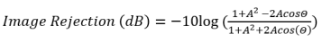 In a practical world, things are never perfect. Mixer conversion loss can be slightly different from one mixer to another, and so can conversion phase. Power splitters (0⁰ and 90⁰) also have inherent amplitude and phase unbalance. The cascaded effect these imperfections can be stated as Amplitude Unbalance A(dB) and Phase Unbalance (Θ⁰). The effect of A and Θ on image rejection can be computed [1] as follows:
