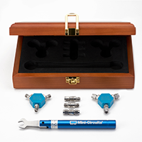 The kit is supplied in a wooden storage and display case, containing a full set of SOL standards (Short, Open & Load, each with male and female options), full set of phase-equal Thru standards (female to female, female to male, male to male) and breakover torque wrench.