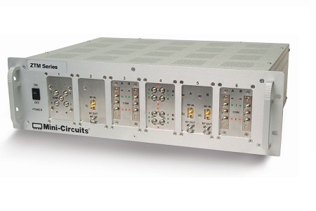 Mini-Circuits’ ZTM series modular switch & attenuator systems offer flexibility and fast turnaround for automated test setups. The design consists of a 19” rack chassis (3U height) comprising up to 12 open hardware slots on the front panel, customizable from a wide range of switch or attenuator options: