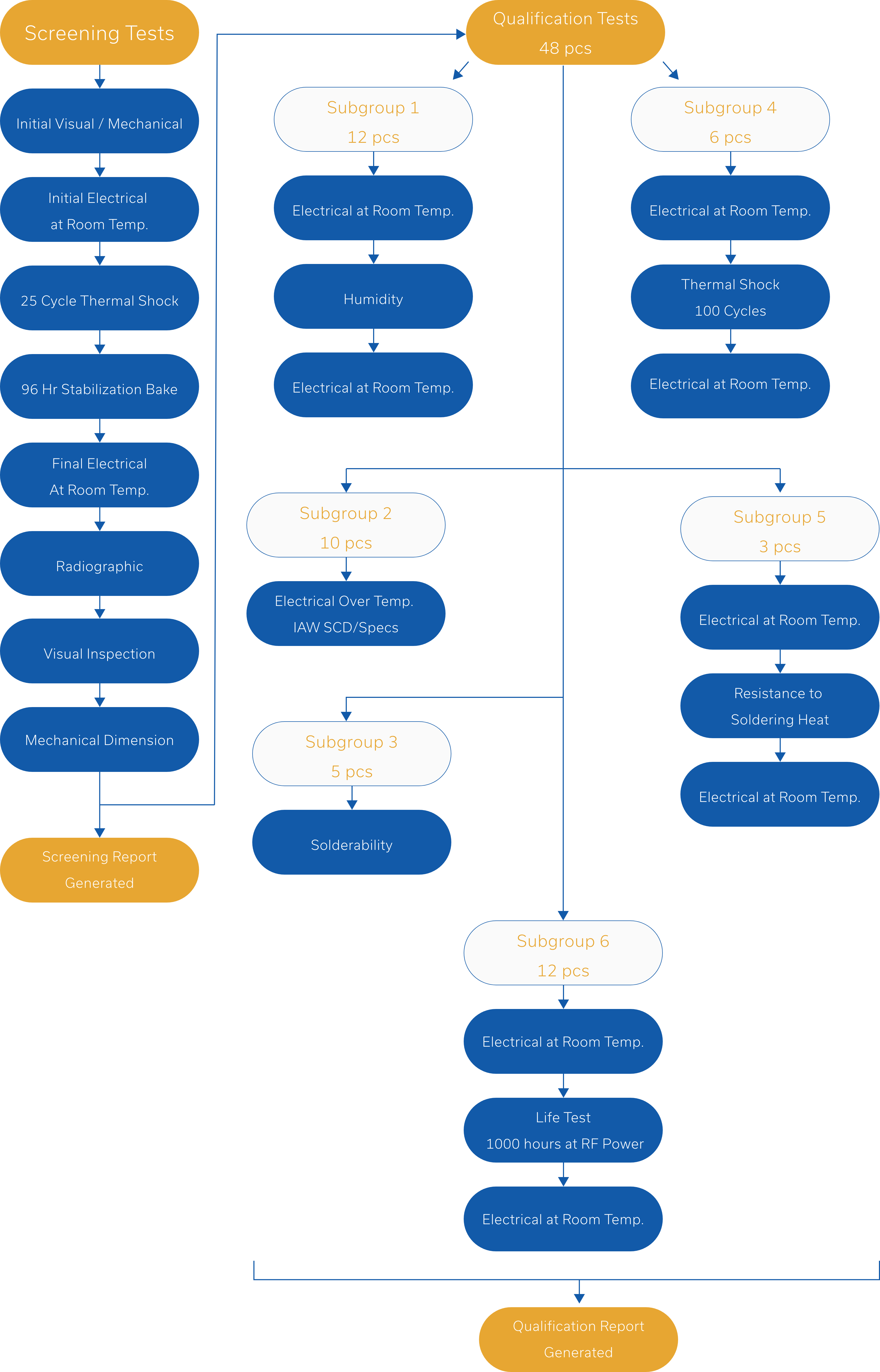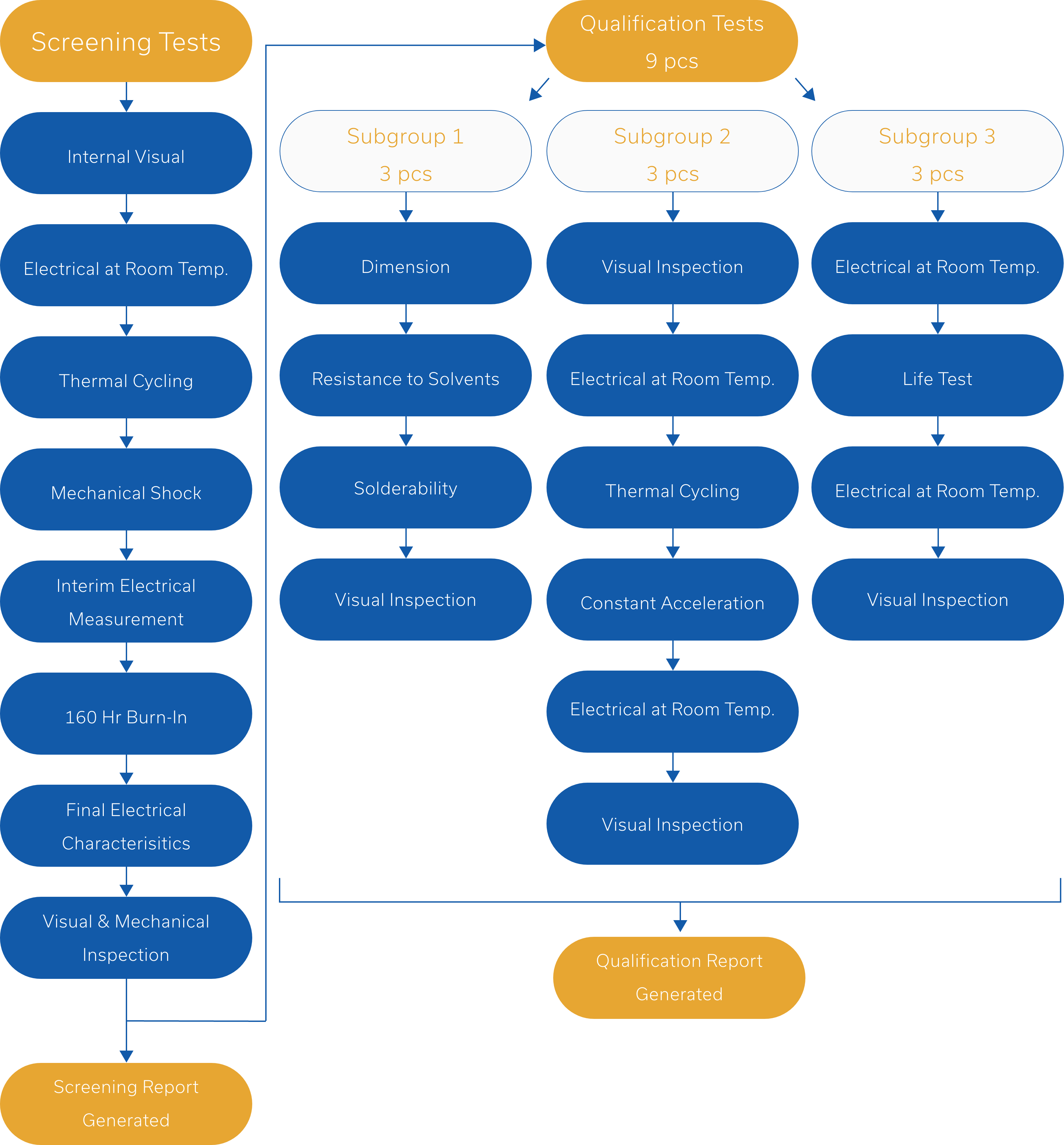 Standard Capabilities: Burn-in, thermal shock, vibration*, radiographic inspection*, destructive physical analysis (DPA)*, mechanical shock, hermeticity, outgassing requirements, residual gas analysis, and hydrogen poisoning susceptibility with accompanying acceptance test procedure (ATP).